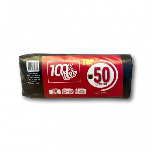Saco Para Lixo em Bobina TOP 50 Litros Preto; Vendido por pacotes, fardo com 10 rolos; Peso aproximado: 3,8kg; Espessura: grossa.