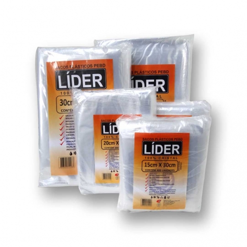 Sacos Plásticos PEBD Líder 60cm x 80cm. Vendido por quilo, fardo com 20 pacotes; Peso aproximado: 1kg; Espessura 12.